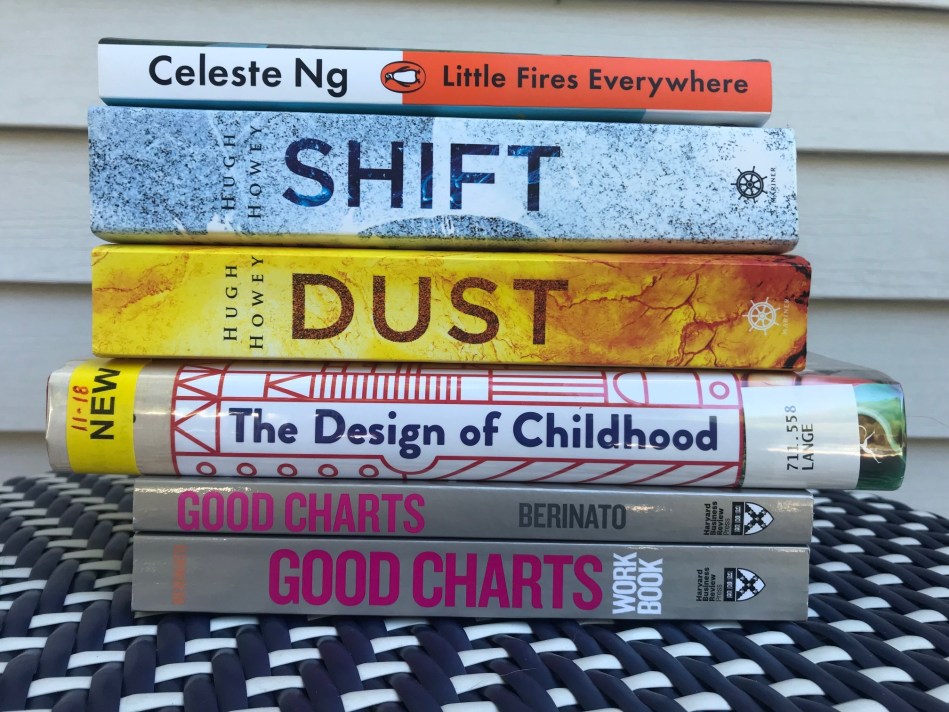 For the past seven years, I’ve been tracking the books that I read by taking a photograph of my book stack at the end of each month, and posting it on Facebook. Today as I post the picture of books I read in June of 2019, I thought it might be cool to create a Dear Data postcard of the books I’ve read, to see if I notice any trends.
